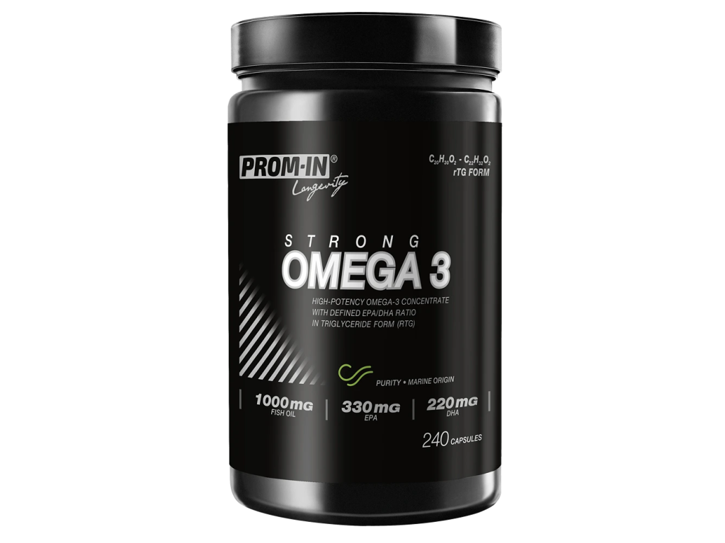 Omega 3 Strong je doplnok stravy s vysokým obsahom omega-3 mastných kyselín EPA a DHA vo forme re-esterifikovaných triglyceridov (rTG). Táto forma je prirodzená pre ľudský organizmus a je spájaná s dobrou biologickou dostupnosťou.